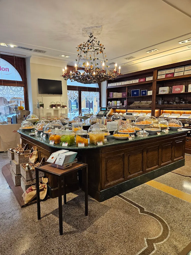 The shop has a deeply evocative atmosphere: antique furniture, terrazzo floors, tiered stands and large glass jars filled with dried and candied fruit, displayed almost like small treasures. It’s not just a store, but a true boutique of taste, with an aesthetic that recalls the early 20th century, when everything began right here in the Albenga plain.