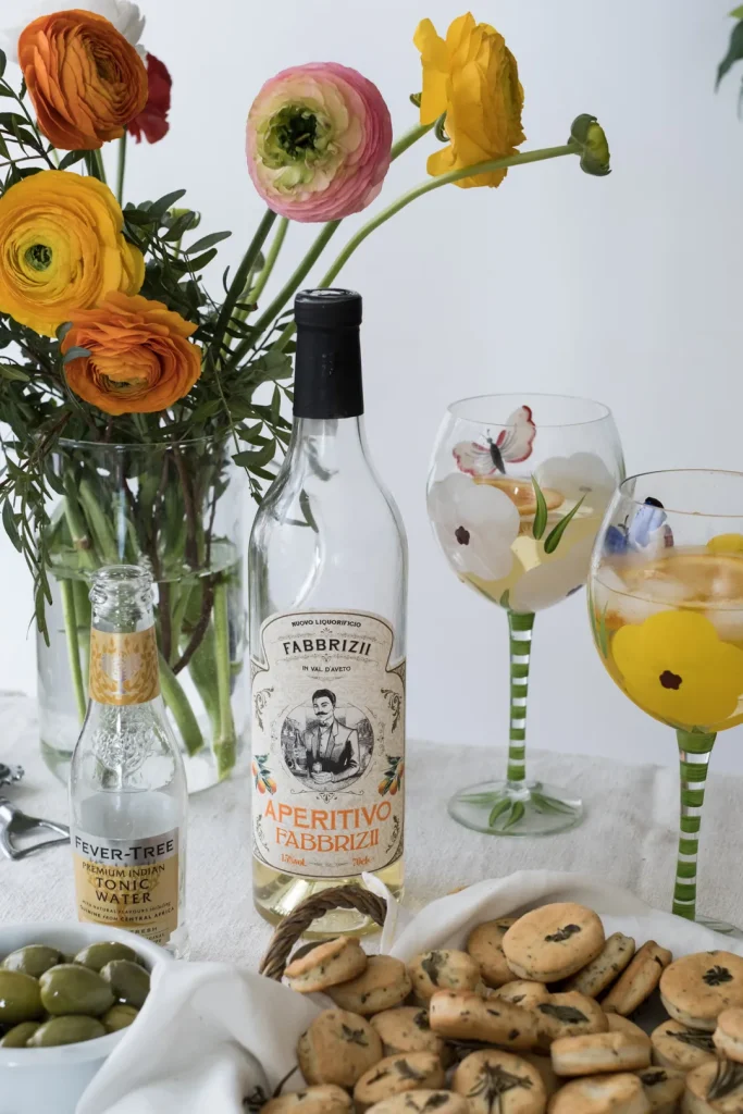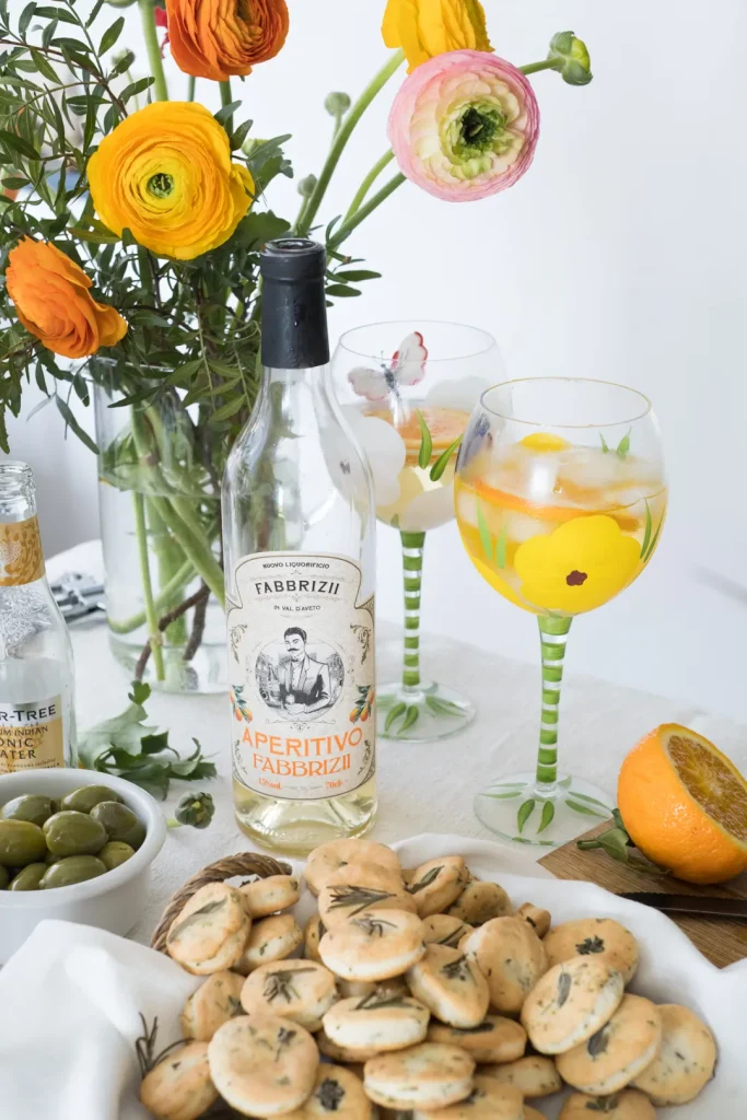 Quale aperitivo offrire? Io li ho accostati ad un aperitivo leggermente alcolico preparato con una mia grande passione primaverile, l’Aperitivo Fabbrizii.  Un liquore leggero (16%) dalle note dolci, profumate e marcatamente agrumate, ideale per le prime bicchierate all’aperto.