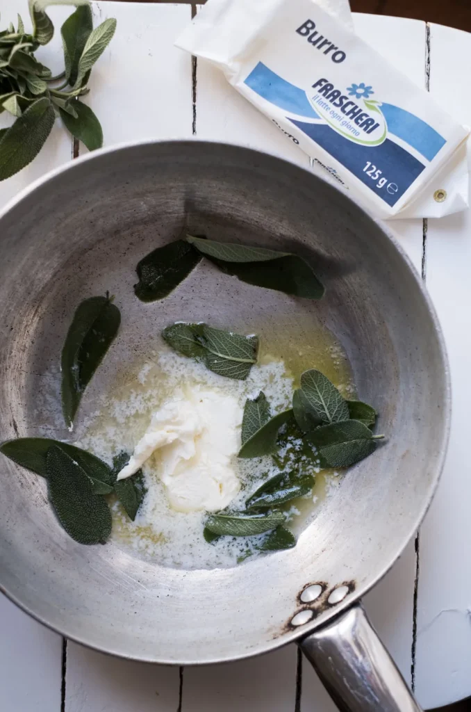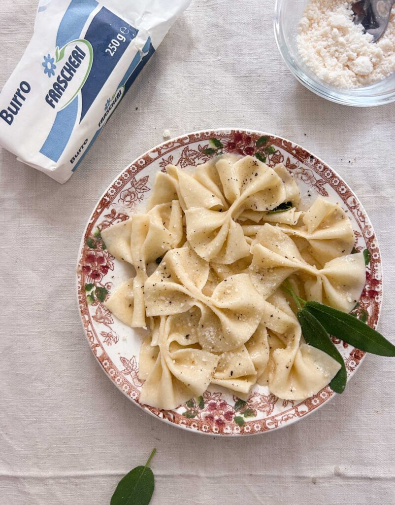 Per dare risalto alla forma e al gusto della pasta fresca ho deciso di usare uno dei condimenti più semplici e buoni che io conosca: burro, salvia e parmigiano.